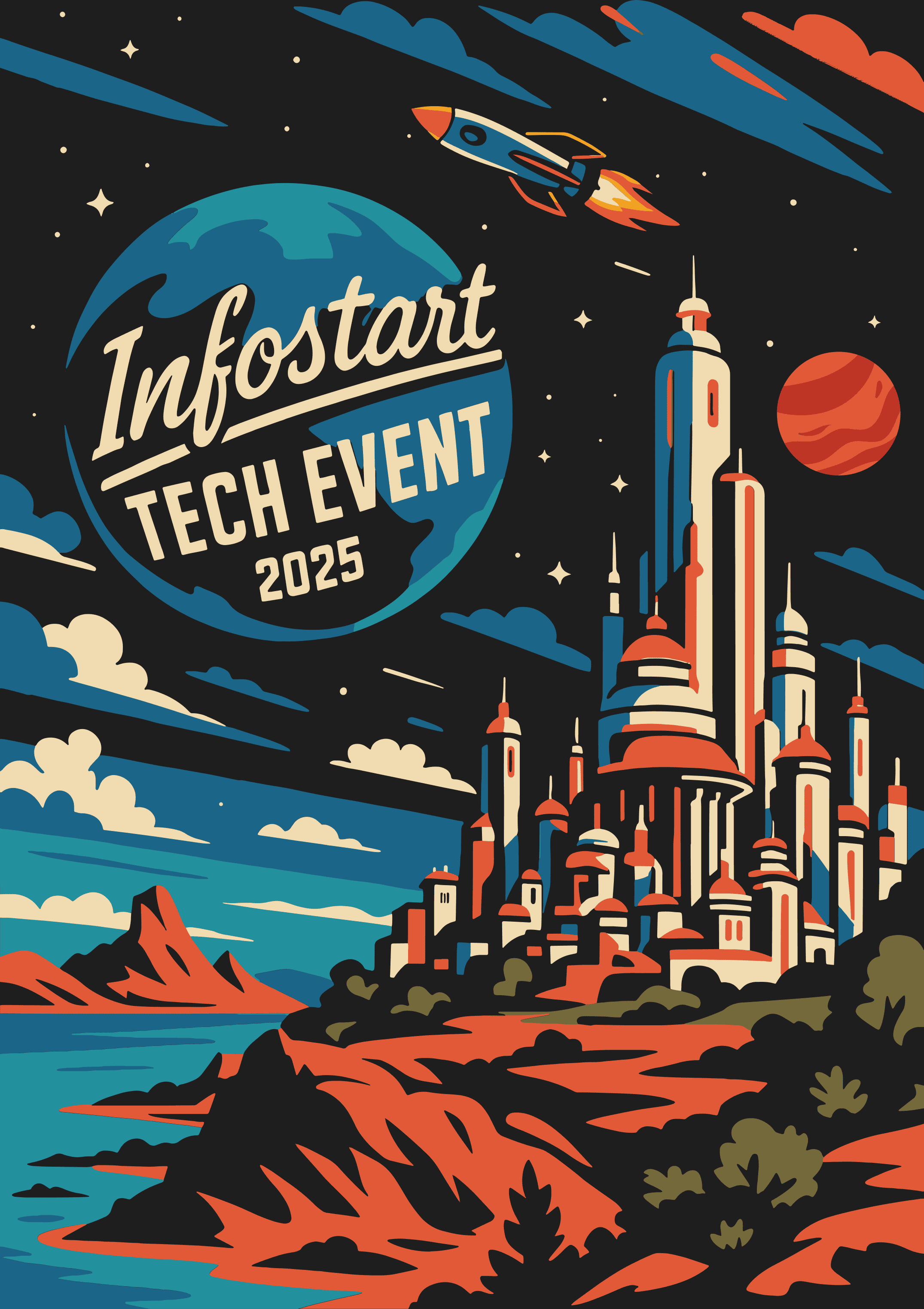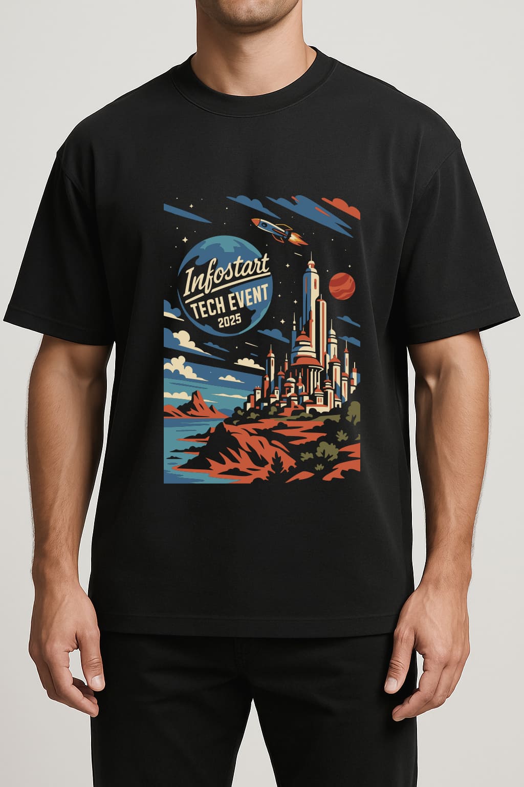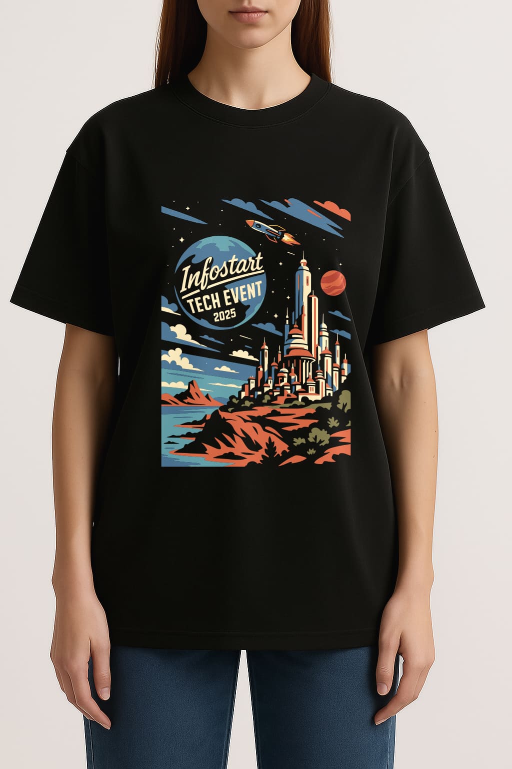 Лимитированная оверсайз футболка в стилистике ретрофутуризм Infostart Tech Event 2025. Идеальный подарок себе и близким на память о конференции.