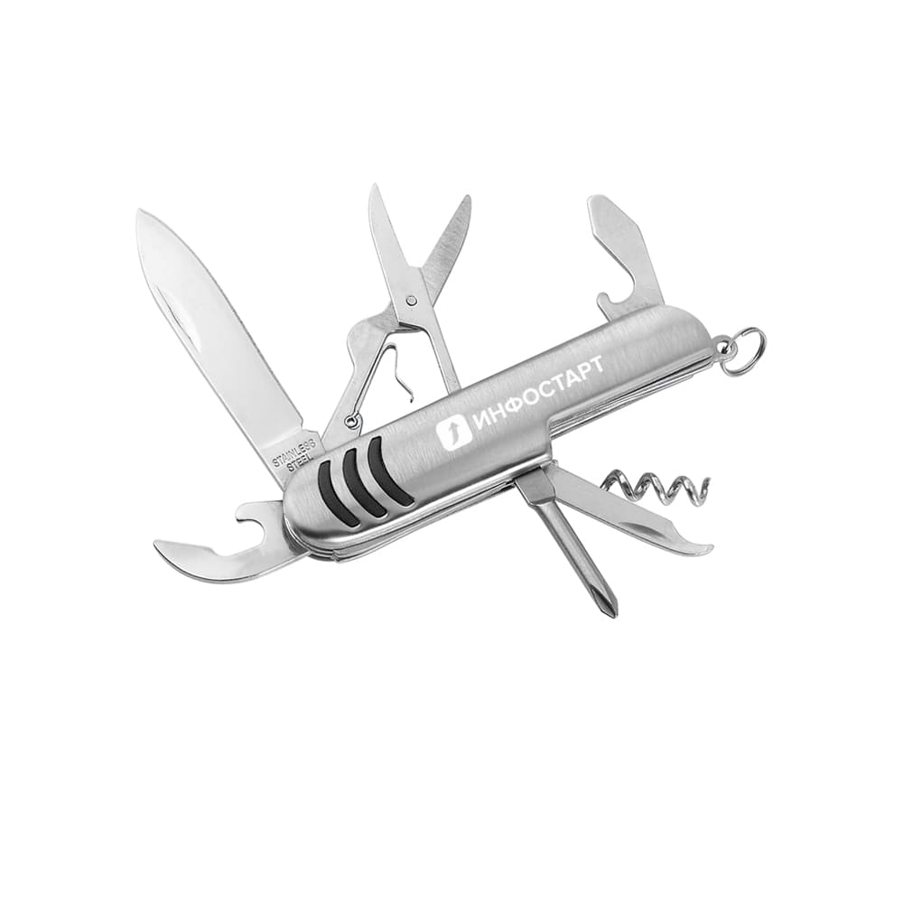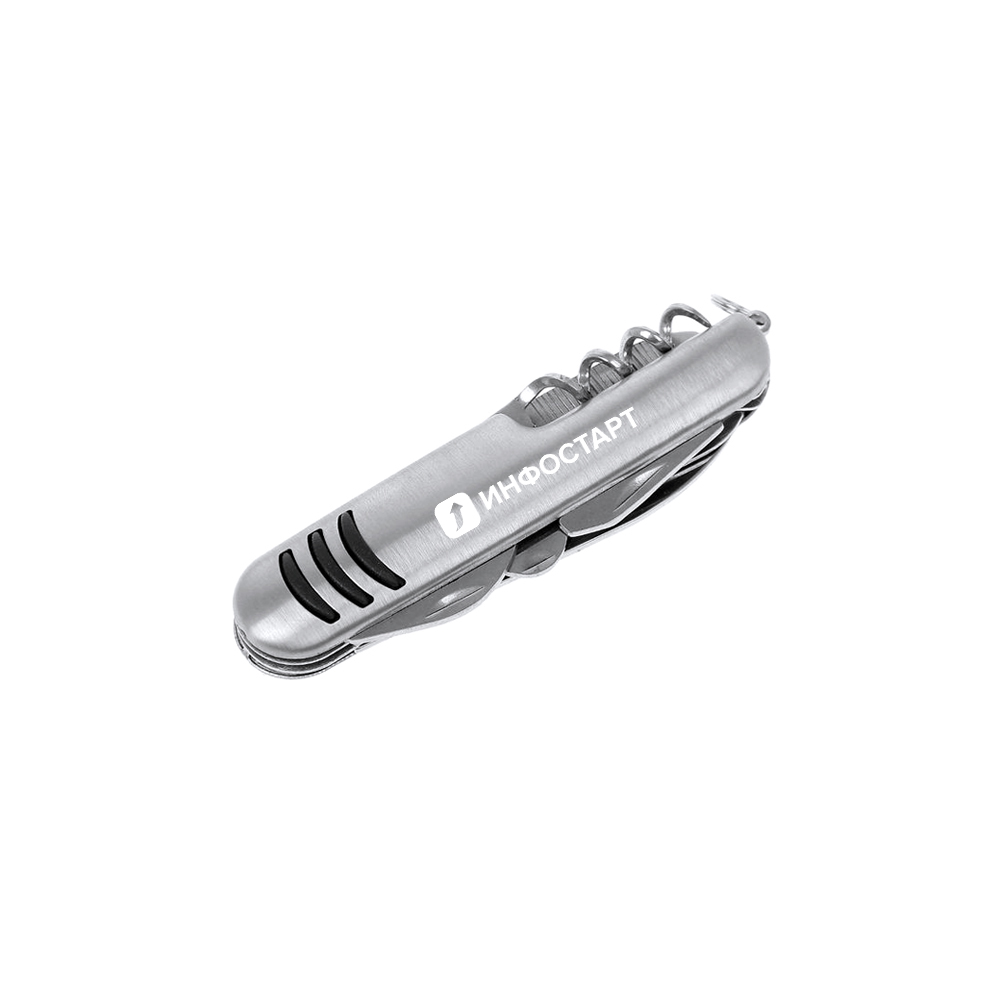 - Складной нож - штопор, нож, пилочка, крестовая отвертка, ножницы, кольцо для ключей, 2 открывашки.