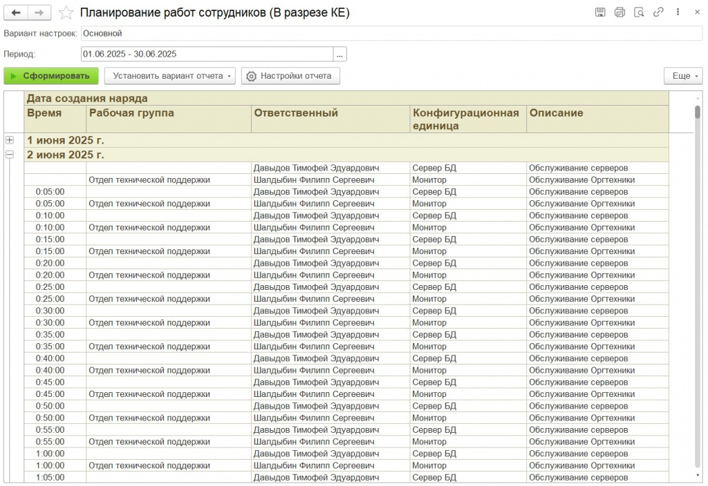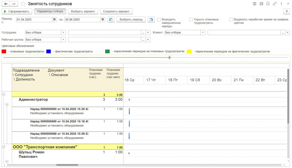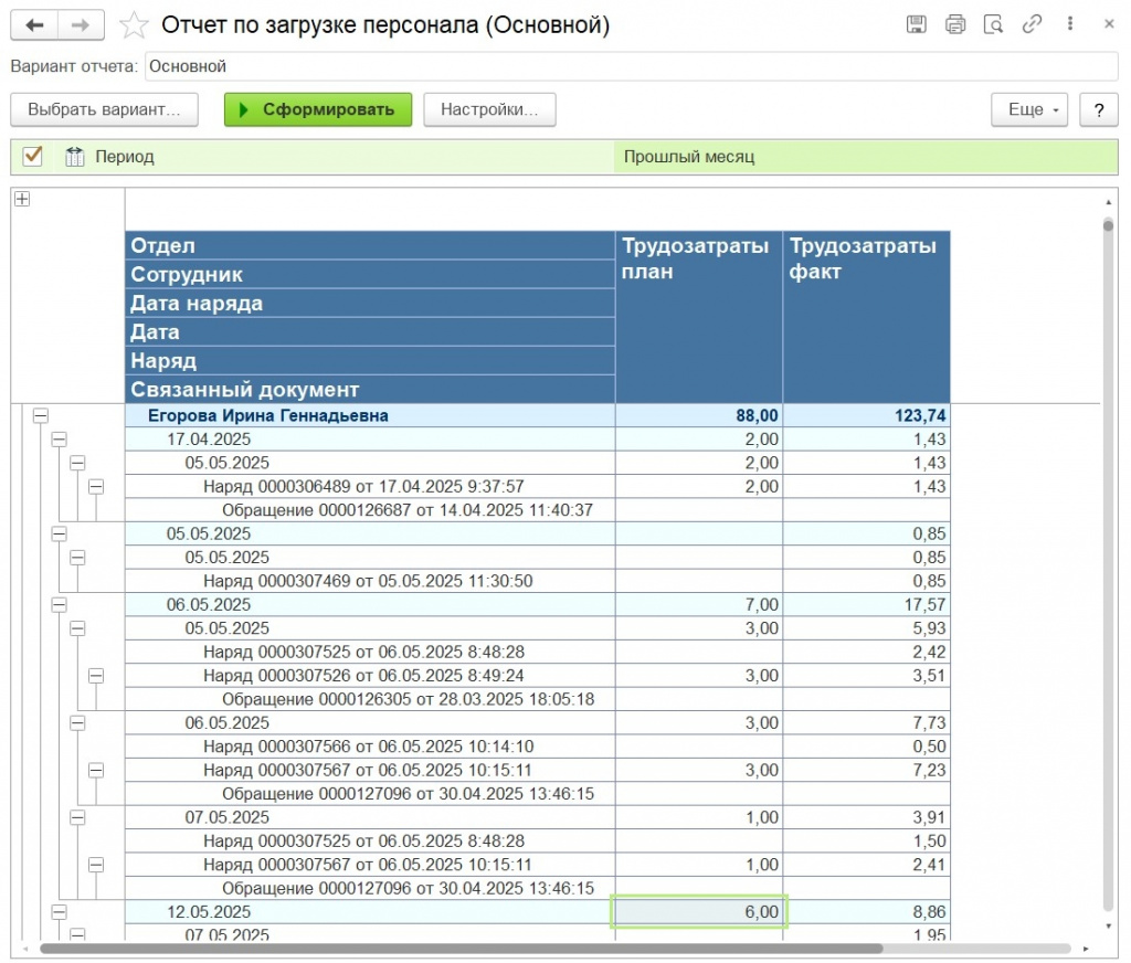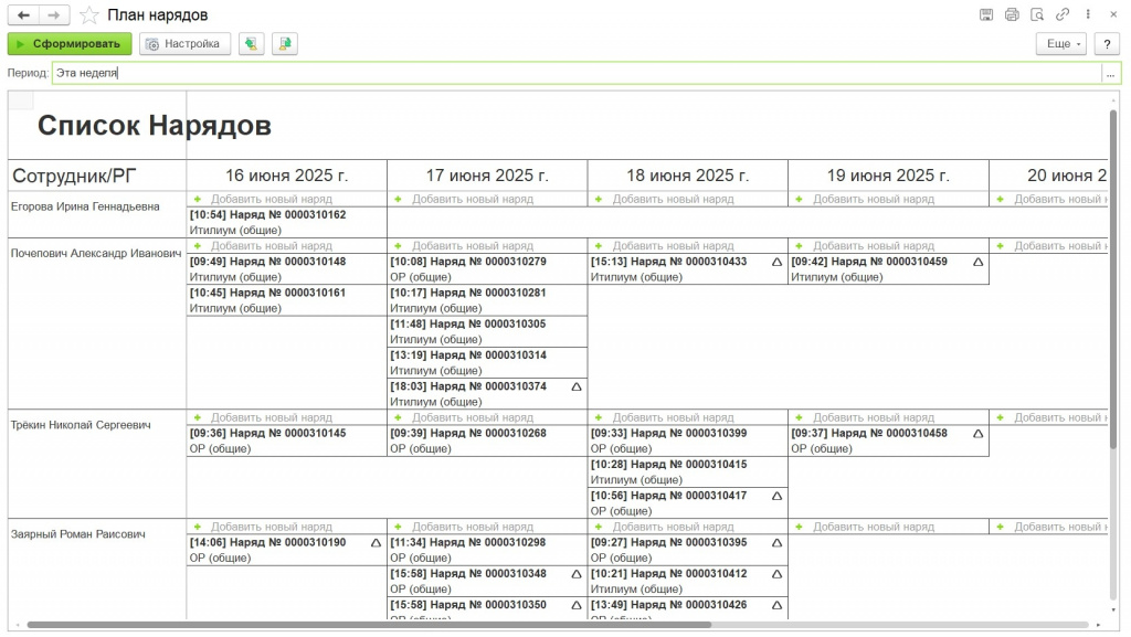 Список нарядов на выбранный период по выбранным сотрудникам. Выводит все запланированные задачи и прямо из отчета можно: