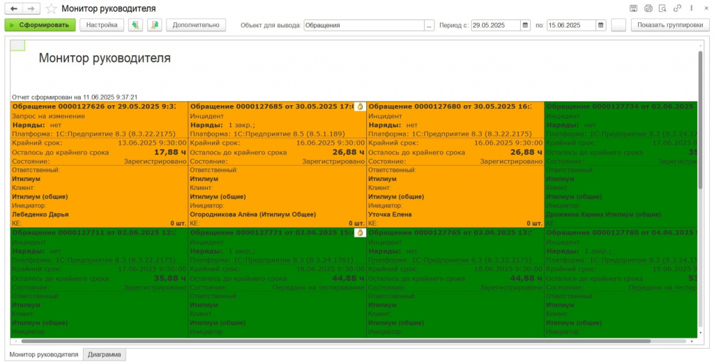 Показывает все обращения или наряды, которые находятся в работе: что уже просрочено, где риски, кто ответственный. Обновляется автоматически. Подходит для: