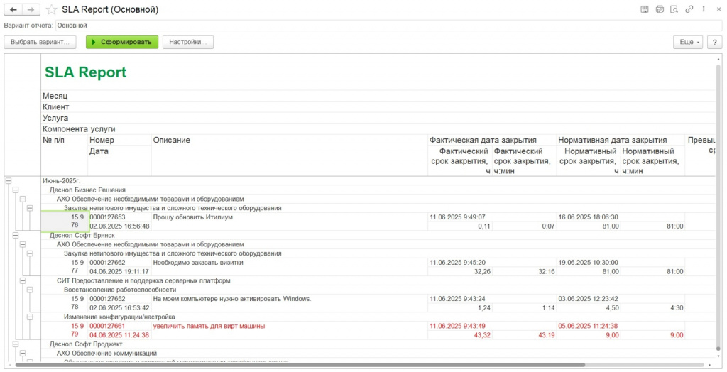 Второй отчёт посвящён SLA и служит инструментом оценки объёмов оказанных услуг. Он показывает не только общую статистику, но и распределение по клиентам и категориям услуг. В системе также ведётся учёт всех незакрытых обращений: формируется реестр задач со статусом «в работе», позволяющий контролировать бэклог и отслеживать риски по срокам исполнения.