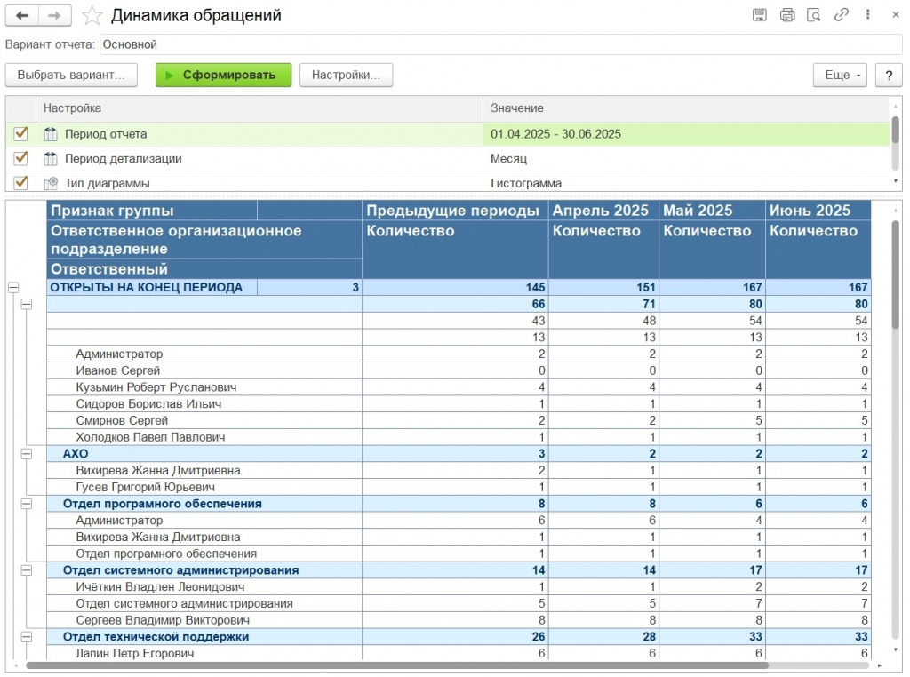 Первый отчёт отслеживает динамику обработки обращений. Он фиксирует, сколько задач поступило, было закрыто и остаётся в работе — как в целом, так и по каждому клиенту отдельно. Также в отчёте содержится детализация по типам услуг. Отдельный блок посвящён обращениям по мобильному приложению — данные представлены в виде наглядной диаграммы, что позволяет оперативно выявлять тенденции и реагировать на возможные проблемы.