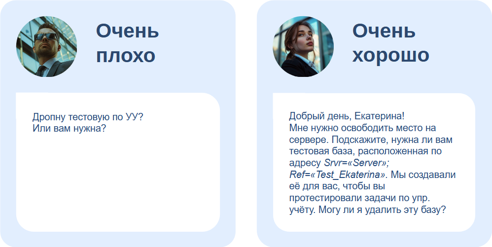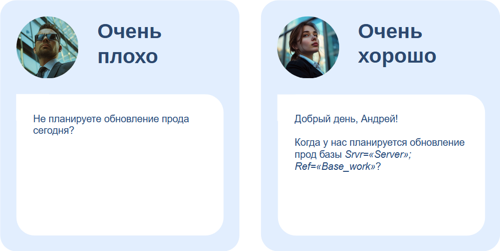 На картинках ниже – примеры хороших и плохих вопросов. Например, если вы спросите заказчика «дропнуть ли тестовую по УУ», он, скорее всего, не поймет, что это значит.