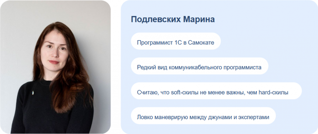 Меня зовут Марина Подлевских. Я работаю программистом в компании Самокат на позиции мидл-разработчика 1С.