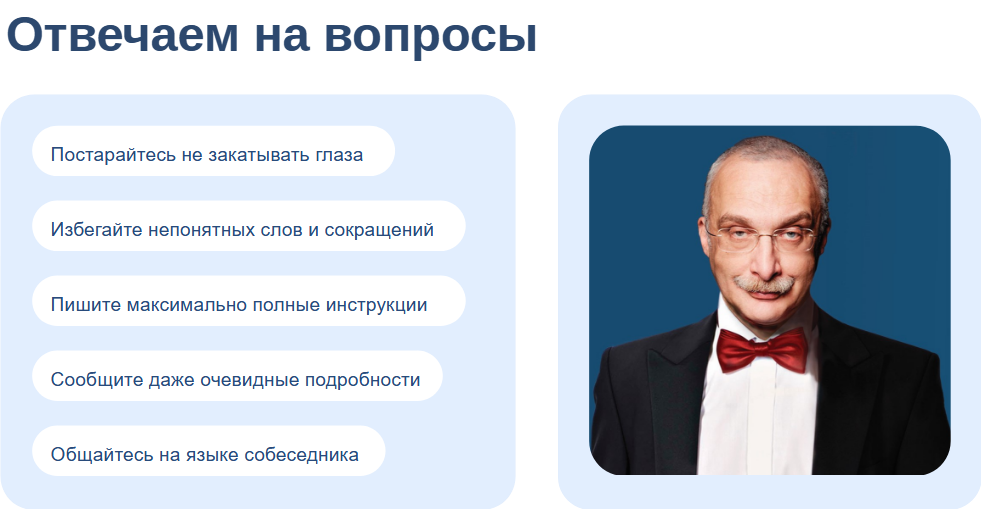 От эксперта хочется получить понятный ответ без сокращений, сленга и сложных терминов. Иногда, например, разработчики используют англицизмы, и приходится дополнительно гуглить – это неудобно и снижает уверенность. Поэтому инструкции лучше писать максимально просто и подробно, чтобы было понятно каждому.
