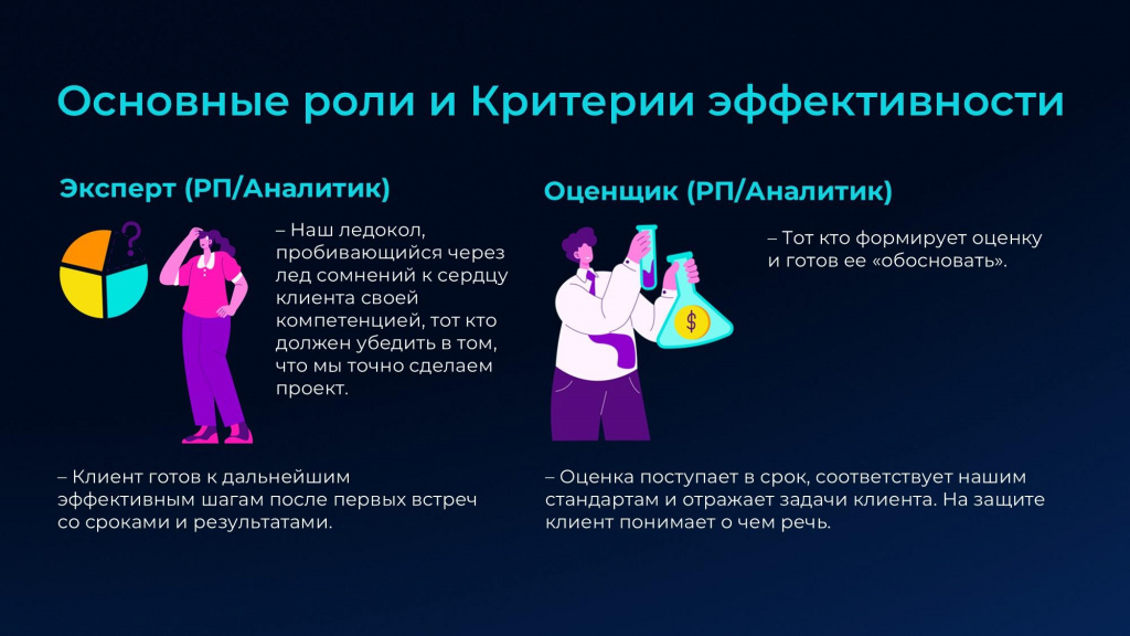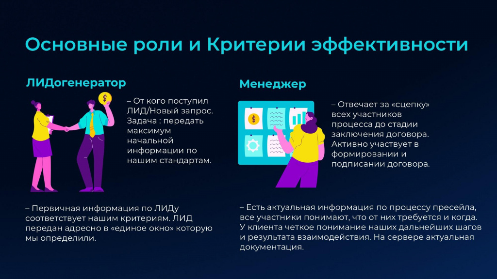 Теперь поговорим о том, какие роли в процессе пресейла бывают, и по каким критериям оценивать их эффективность.