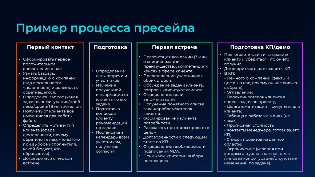Основная причина неудачных пресейлов в том, что новые запросы передаются в работу несистемно и без первичной информации. Чтобы этого избежать, необходимо:
