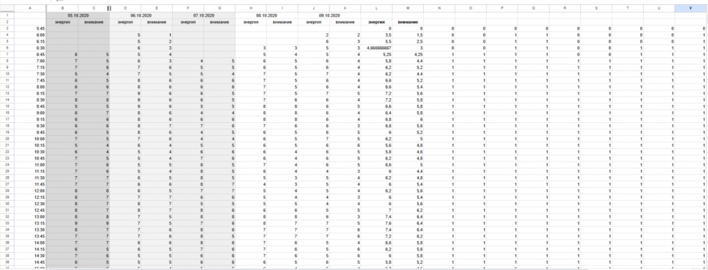 В течение 5 дней я проводил замеры каждые 15 минут, оценивая оба показателя по шкале от 0 до 10. Сделал таблицу в Excel, разлиновал, вывел средние значения и построил графики. Вот как это выглядит: