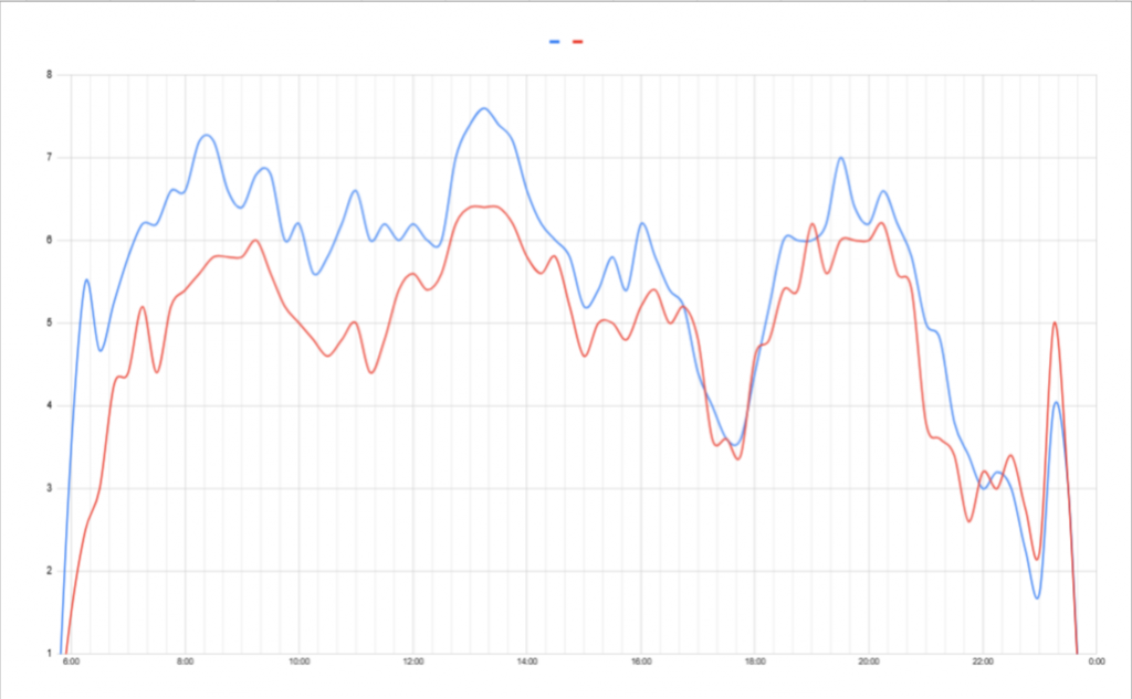 В течение 5 дней я проводил замеры каждые 15 минут, оценивая оба показателя по шкале от 0 до 10. Сделал таблицу в Excel, разлиновал, вывел средние значения и построил графики. Вот как это выглядит: