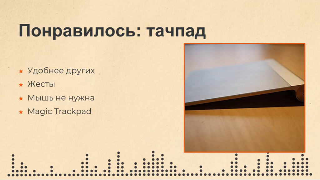 После привыкания к этому тачпаду мышка становится не нужна. И когда потом пересаживаешься на обычные Windows-ноутбуки, понимаешь, насколько там тачпады неудобные.