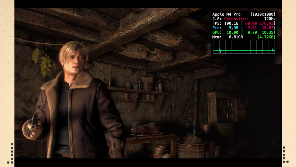 Это современная трехмерная игра с хорошей графикой Resident Evil (2023). Она идет в среднем с частотой около 80-100 кадров в секунду. Да, макбук с ней уже ощутимо нагревается, но не троттлит – можно несколько часов играть вообще без потерь производительности.
