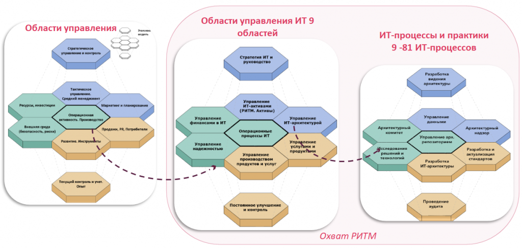 Таким образом, модель РИТМ позволяет двигаться от корпоративного управления к управлению ИТ и далее – к детализированным областям, таким как управление архитектурой и управление данными, которые в модели объединены между собой.