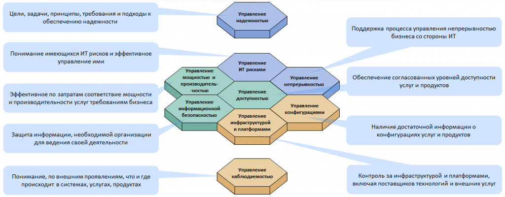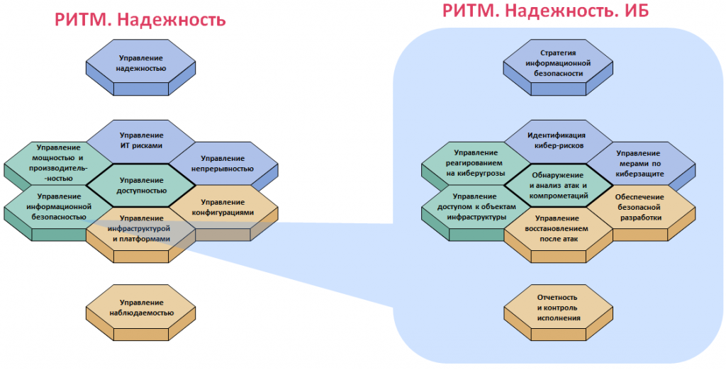 В рамках Надежности реализована интеграция ИТ с информационной безопасностью. Область информационной безопасности разворачивается в собственную структуру областей управления, но при этом остается интегрированной с общей системой управления информационными технологиями.