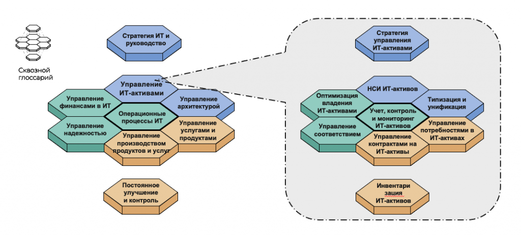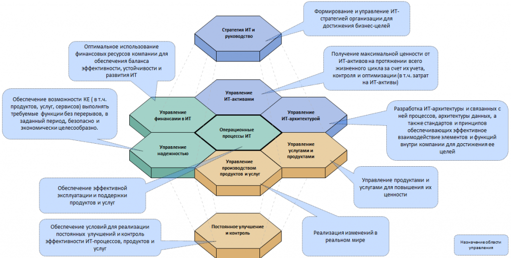 Каждая область управления включает в себя отдельные практики и процессы, и может быть детализирована по принципу фрактальности, формируя собственную сотовую модель. В центре находится корпоративное управление ИТ. Для управления ИТ необходимы стратегия, непрерывное совершенствование, управление разработкой, операционные процессы, учет активов, надежность, архитектура и понимание финансовых ограничений и возможностей.