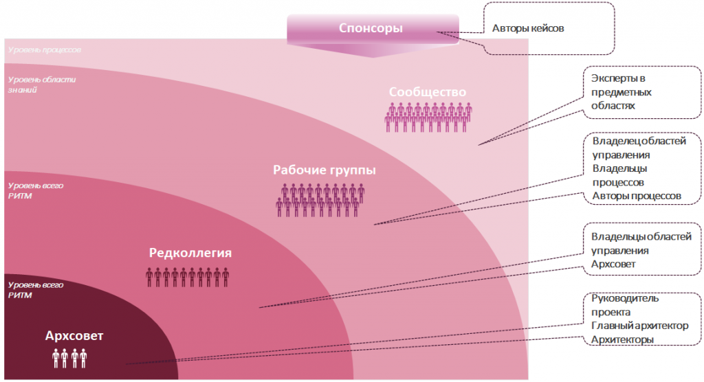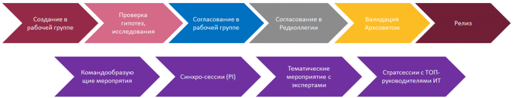 Мы разработали способ организации работы над РИТМ. Работа выстроена по областям управления. У каждой области есть владелец, аналог product owner, который формирует команды и организует рабочие процессы. Существует верхний совет как ядро всей методологии и редакционная коллегия, которая проверяет материалы авторов на адекватность и целостность. Все материалы обсуждаются и дорабатываются в коллективном формате.