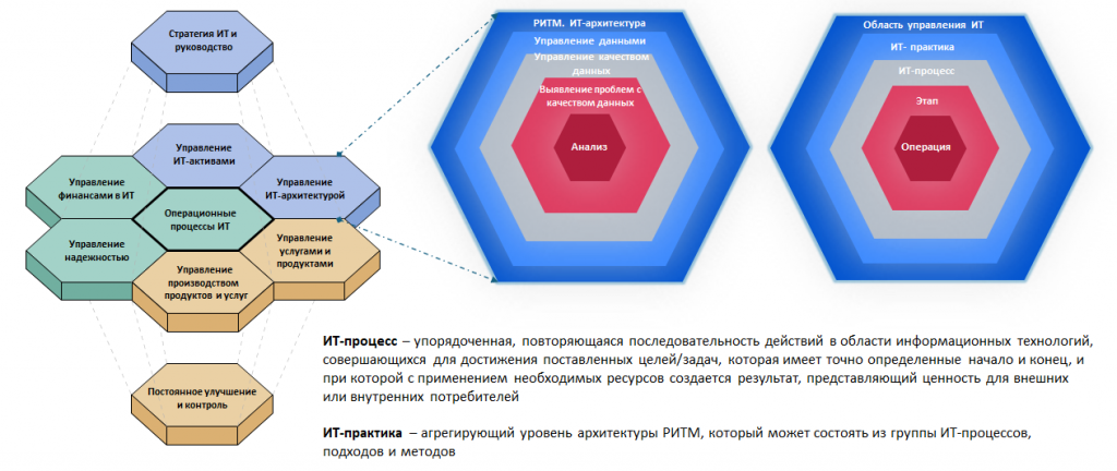 РИТМ – это совокупность методологий, бизнес-процессов и описаний, которые создаются совместно с различными авторами. Он разделен на области управления. В основе лежит базовое описание того, что необходимо для управления информационными технологиями. Далее следуют области стратегического, тактического и оперативного управления, а также непрерывного совершенствования.