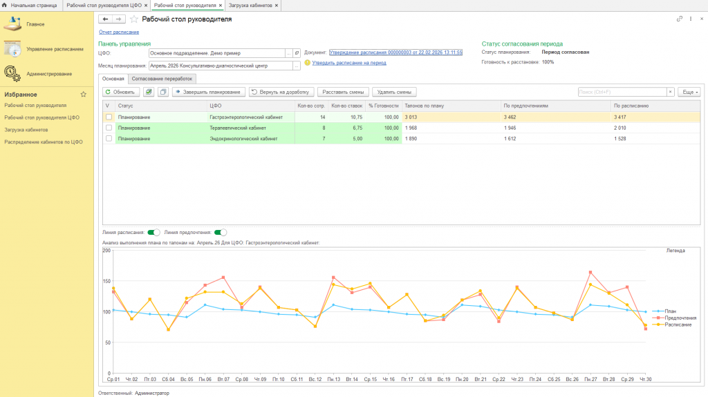 Ну и рабочий стол руководителя подразделения, на котором он может следить за процессом подготовки расписания в разрезе отделов. Тут уже просто статистика и тот же основной график по каждому отделу для контроля. Задача руководителя проконтролировать плавность графиков всех отделов и согласовать или отклонить переработки, если такие были запрошены сотрудниками. После достижения готовности к расстановке кабинетов 100% руководитель нажимает на кнопку «Расставить смены». Система распределит кабинеты по сотрудникам. Всё. План готов.