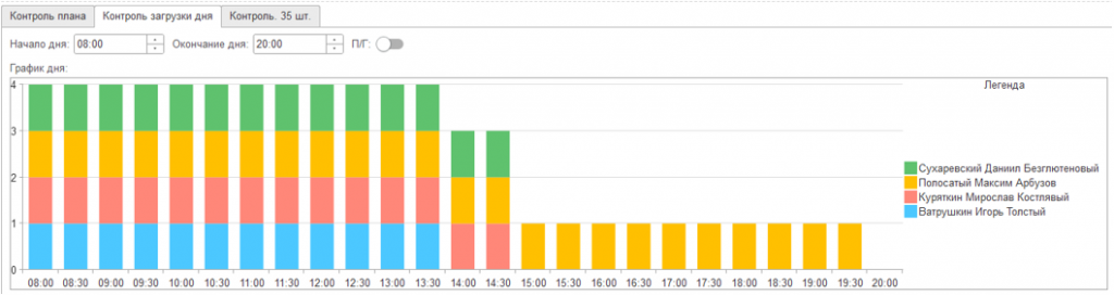 Дополнительный контроль – плавность загрузки внутри дня. Например, при таком распределении, как на скриншоте, желательно сместить время работы одного из сотрудников с первой во вторую половину дня.