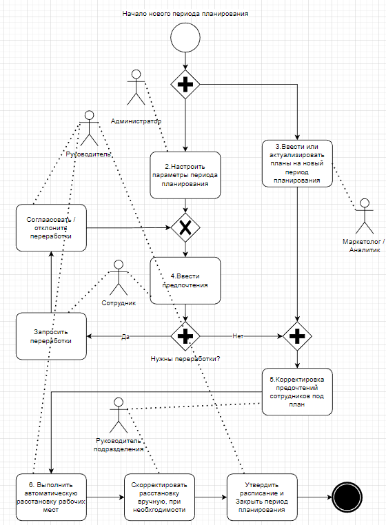 Расписание составляется в excel файлах по каждому ЦФО. Сами сотрудники или администраторы расписания, по поручению сотрудников, заносят в файл расписание на месяц планирования по дням. Далее руководитель ЦФО изучает расписание, проверяет, что сотрудник расписал все свои часы на месяц по штатному расписанию, проверяет разрешённые переработки, плавность составления расписания и соответствие его планам отдела маркетинга. Далее администраторы назначают кабинеты в excel файле вручную. Автоматический контроль загрузки кабинетов отсутствует. Прочие контроли выполняются в ручном режиме визуальным вычитыванием excel файла. Далее расписание вручную вносится в корпоративную ИС.