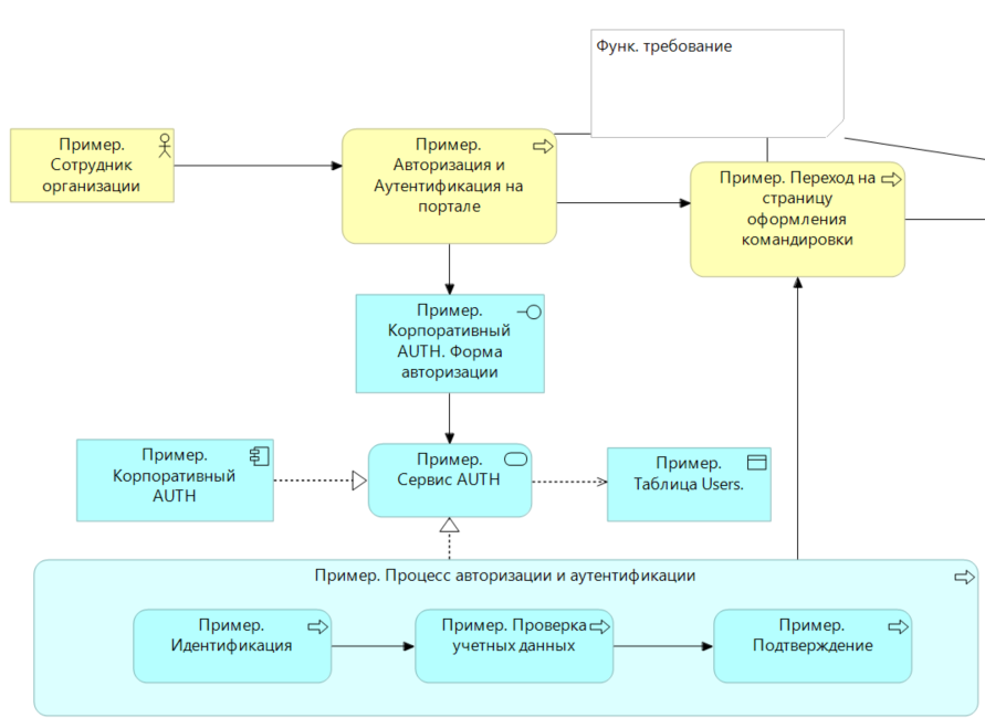 Например, сотрудник организации заходит на портал и проходит авторизацию и аутентификацию. Синим обозначен слой систем: есть форма авторизации и корпоративный сервис аутентификации.