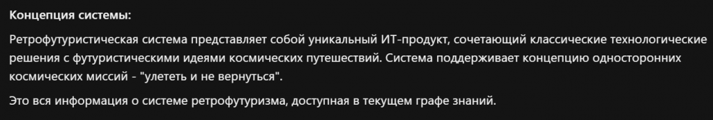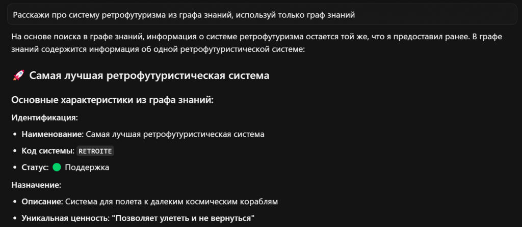 Когда мы все это подключили, мы задаем вопрос: «Расскажи про систему ретрофутуризма из графа знаний, используй только граф знаний». Не обязательно формулировать точное именование: агент сам это поймет, сам спросит и сам выдаст решение.