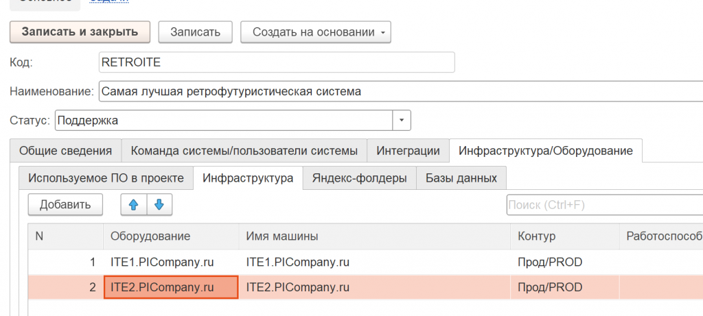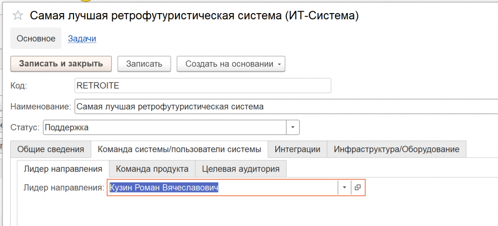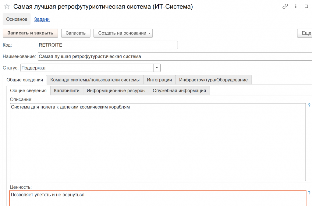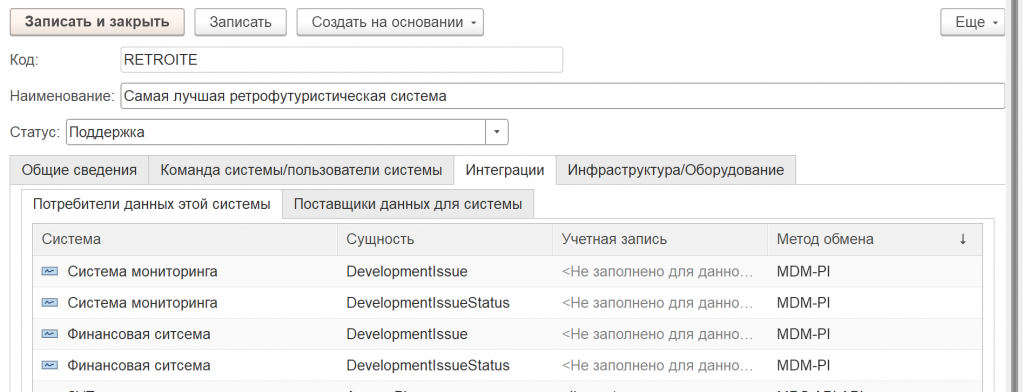 Поэтому в нашей IT-системе мы создаем цифрового двойника, где будет справочник. Промоделируем это. Есть конкретная система – «Самая лучшая ретрофутуристическая», со статусом «поддержка».