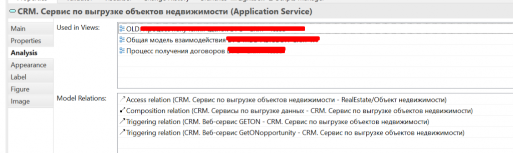 Как я уже говорил, в Archi можно увидеть все связи – стрелки, показывающие, как элементы взаимодействуют. Есть отдельные вьюхи – представления, где проектируются бизнес-процессы. Каждая вьюха отображает конкретную часть архитектуры. Например, CRM-сервис по выгрузке объектов недвижимости используется сразу в трех вьюхах, и это видно на схеме.
