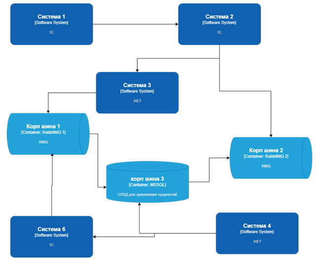 Есть подобие нотации C4. У нас есть система 1, система 2, система 3 – они взаимодействуют через корпоративную шину: одну, вторую, третью. Где-то используется MSSQL, где-то Rabbit. Потом система 4 на .NET подключается к MSSQL и интегрируется с системой 6, и снова отдает через корпоративную шину 1.