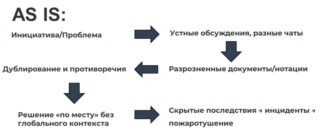 Изначально у нас была инициатива-проблема, которую обсуждали устно и фиксировали в разных чатах. Затем появлялись разрозненные документы – в Confluence, Wiki, Google- и Яндекс-таблицах. Информация дублировалась, решения принимались локально, без понимания глобального контекста: как конкретная система или изменение повлияет на остальные. В результате возникали скрытые последствия, инциденты и постоянное «пожаротушение».