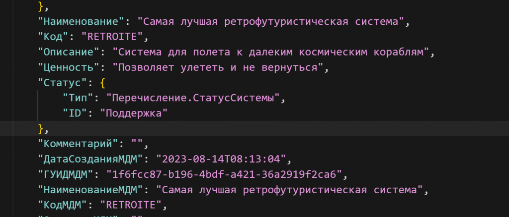 На изображении мы видим JSON: «самая лучшая ретрофутуристическая система», ее описание, ценность. У системы есть реквизиты.
