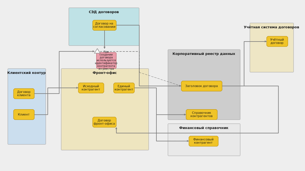 Теперь посмотрим на второй бизнес-процесс. Он не привязан к нотации: есть квадраты в Miro или другом холсте, указаны реальные, не обезличенные системы. Какие-то договоры куда-то отправляются, есть какие-то MDS, что-то создается, куда-то двигается. Есть протокол интеграции, но как все остальное рождается и движется – непонятно.