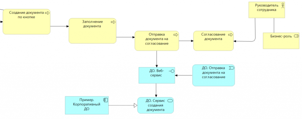 Там он создает документ по кнопке и заполняет его. На схеме два первых желтых квадрата пока ни с чем не связаны – эти шаги можно будет детализировать позже.