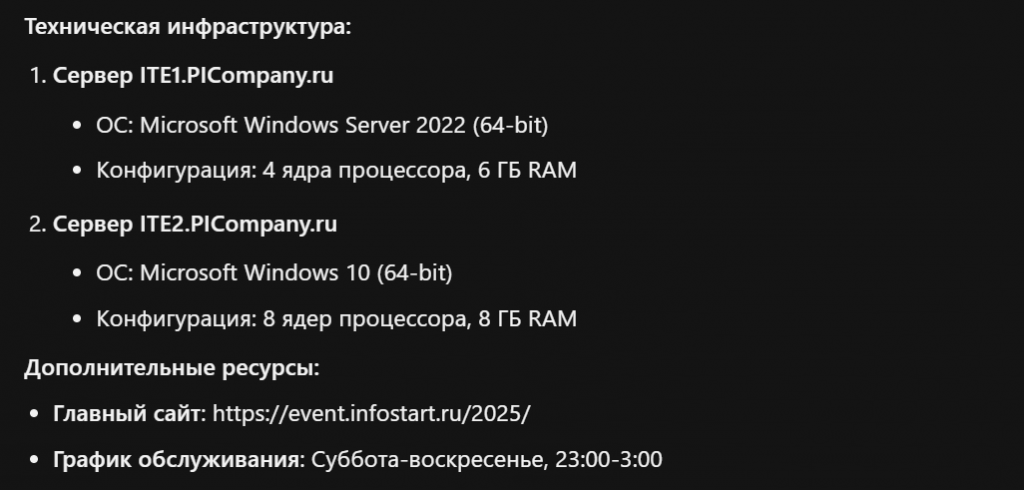 На запрос он возвращает всю доступную информацию: основные характеристики, описание, уникальную ценность («позволяет улететь и не вернуться»), перечень серверов, их ОС, дополнительные ресурсы (например, event.infostart.ru), график обслуживания системы. Все реквизиты он преобразует в ответы.