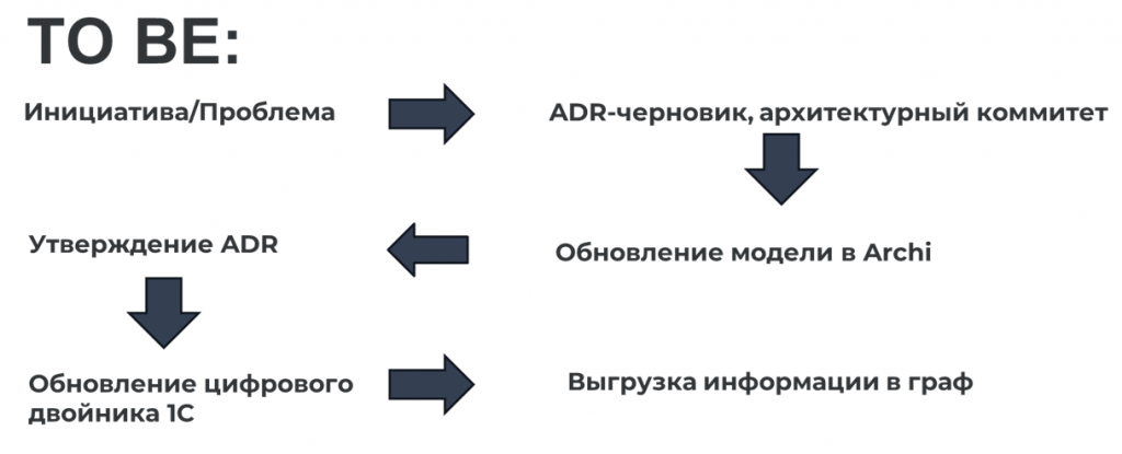 Теперь процесс выглядит иначе. Есть инициатива-проблема – фиксируем ее в черновике ADR. Собираем архитектурный комитет, обсуждаем, формируем решение. Далее обновляем модель в Archi – визуализируем, как это выглядит в архитектуре. После утверждения ADR обновляем цифровой двойник в 1С: пишем простую обработку для загрузки Excel или JSON и синхронизируем данные. Затем выгружаем актуальную информацию в графовую базу, и AI-агент получает возможность отвечать на любые вопросы: по интеграциям, системам, взаимодействиям и статусам.
