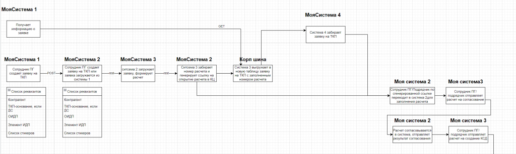Третий бизнес-процесс я проектировал вместе с аналитиком. Аналитик рисовал схему: указаны системы, потоки, есть GET и даже список сущностей, из которых он состоит.
