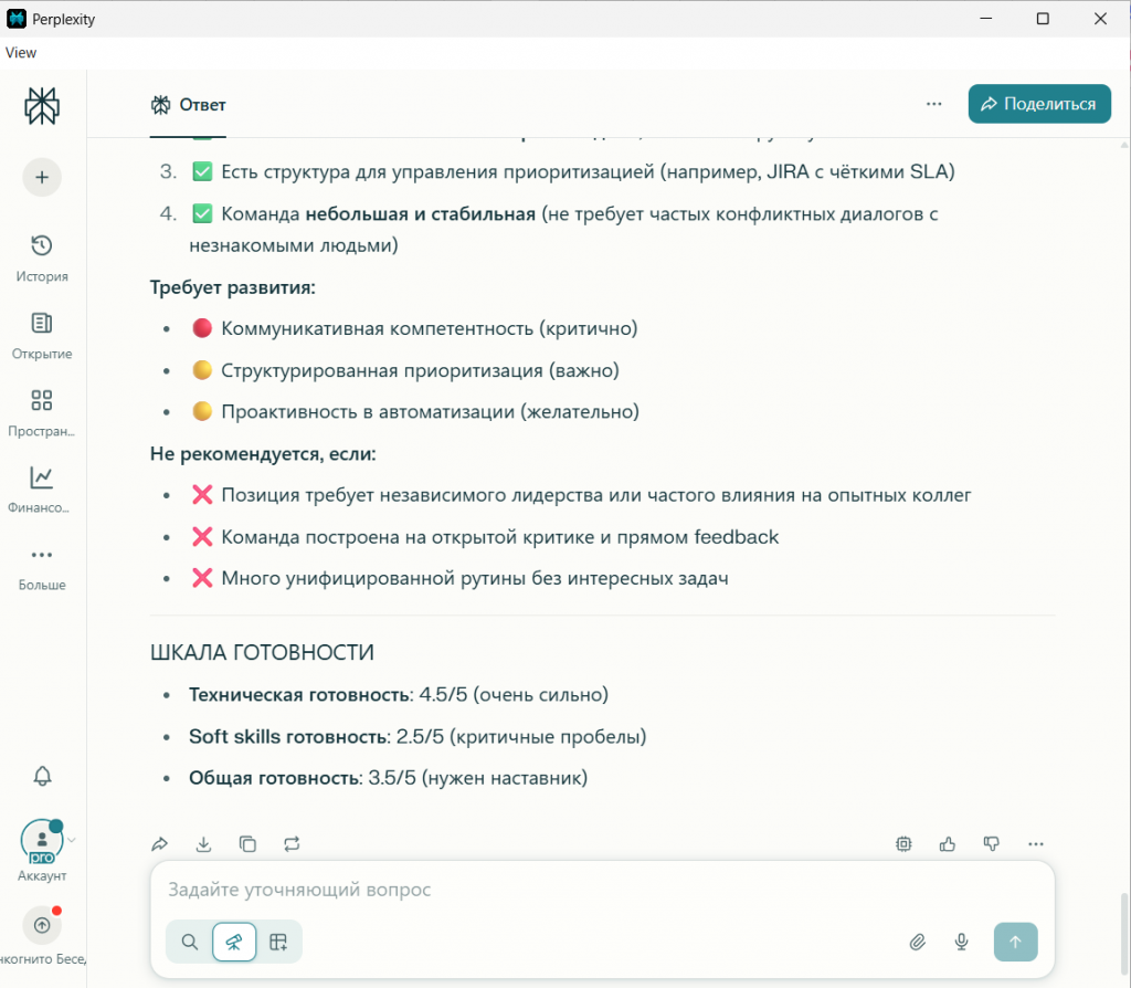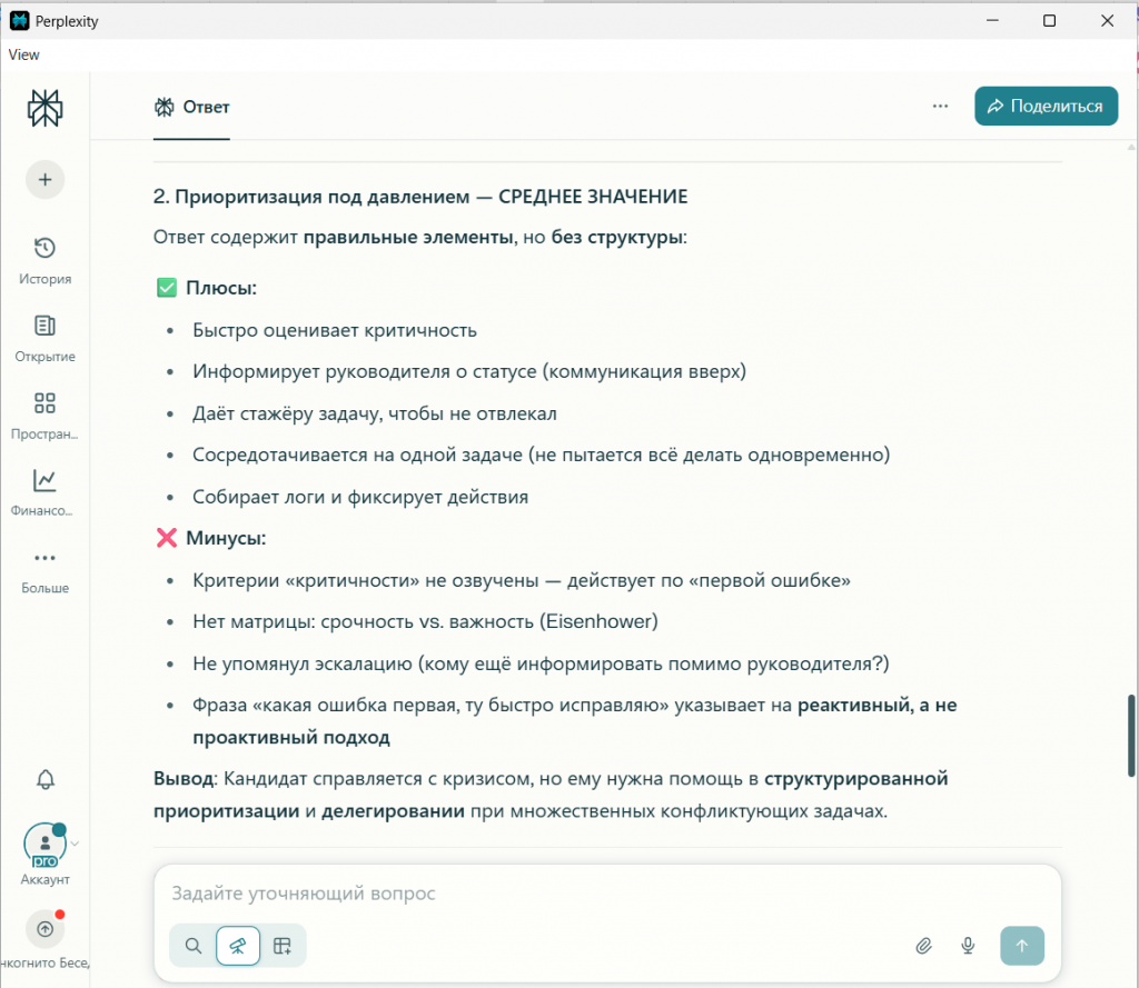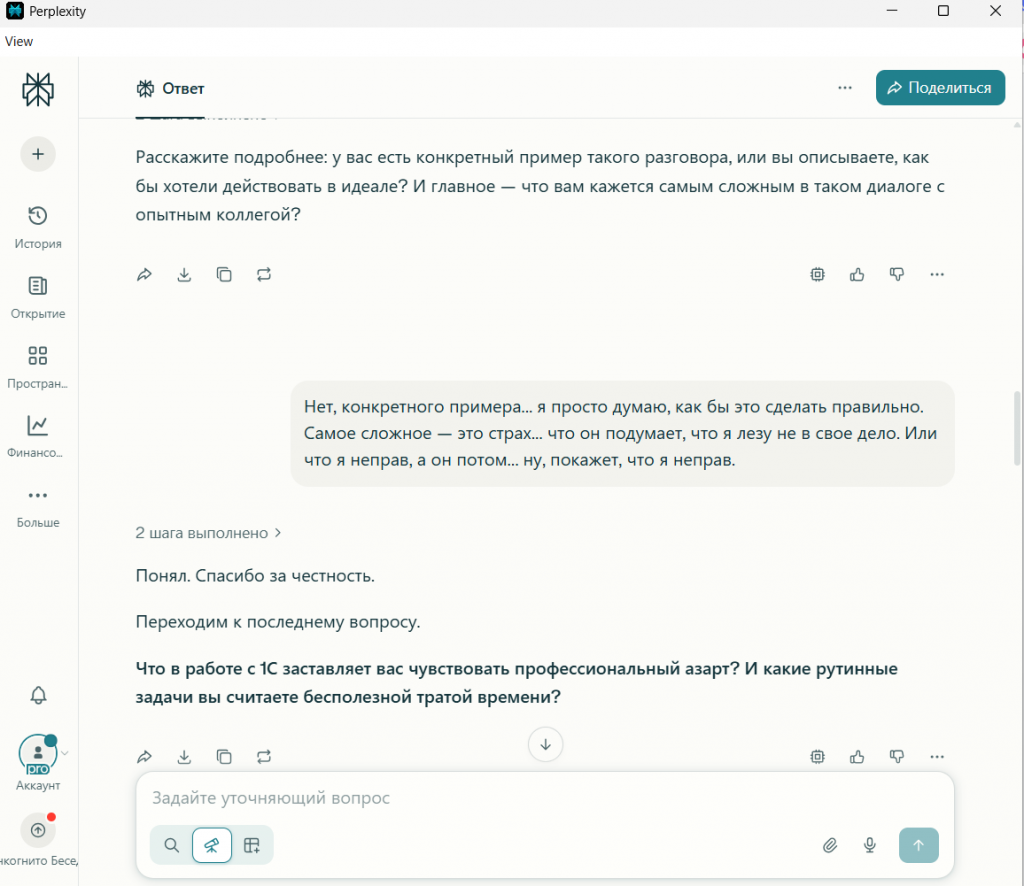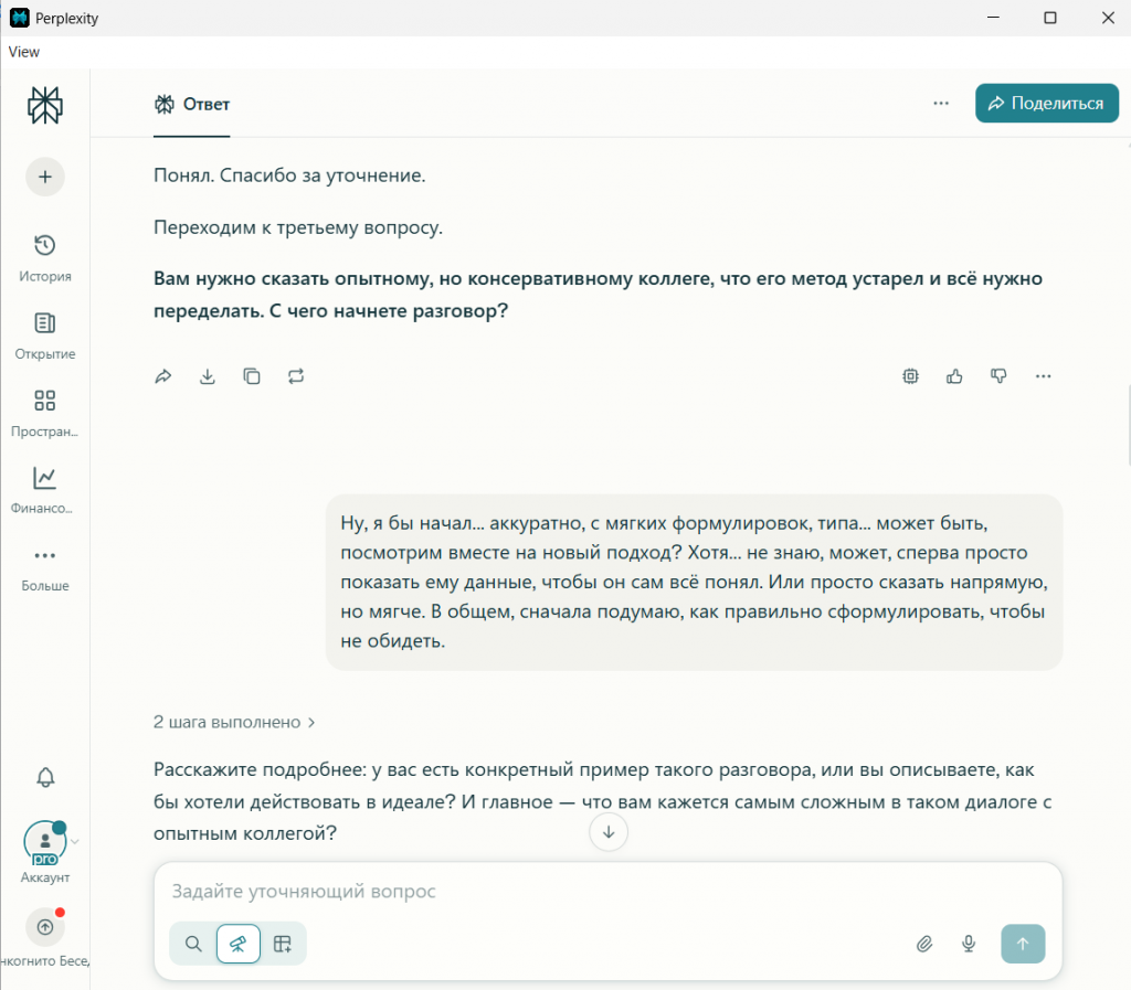 Perplexity спросил: «...что вам кажется самым сложным в таком диалоге с опытным коллегой?». Он сразу уходит с уровня действий на уровень эмоций, пытаясь найти коренную причину проблемы.