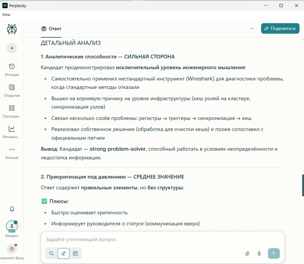 Именно вопрос Perplexity привёл к ключевому признанию «кандидата»: «Самое сложное — это страх... что он подумает, что я лезу не в свое дело». Это была блестящая демонстрация того, как разная постановка вопроса вытягивает из одних и тех же данных разную по глубине информацию.