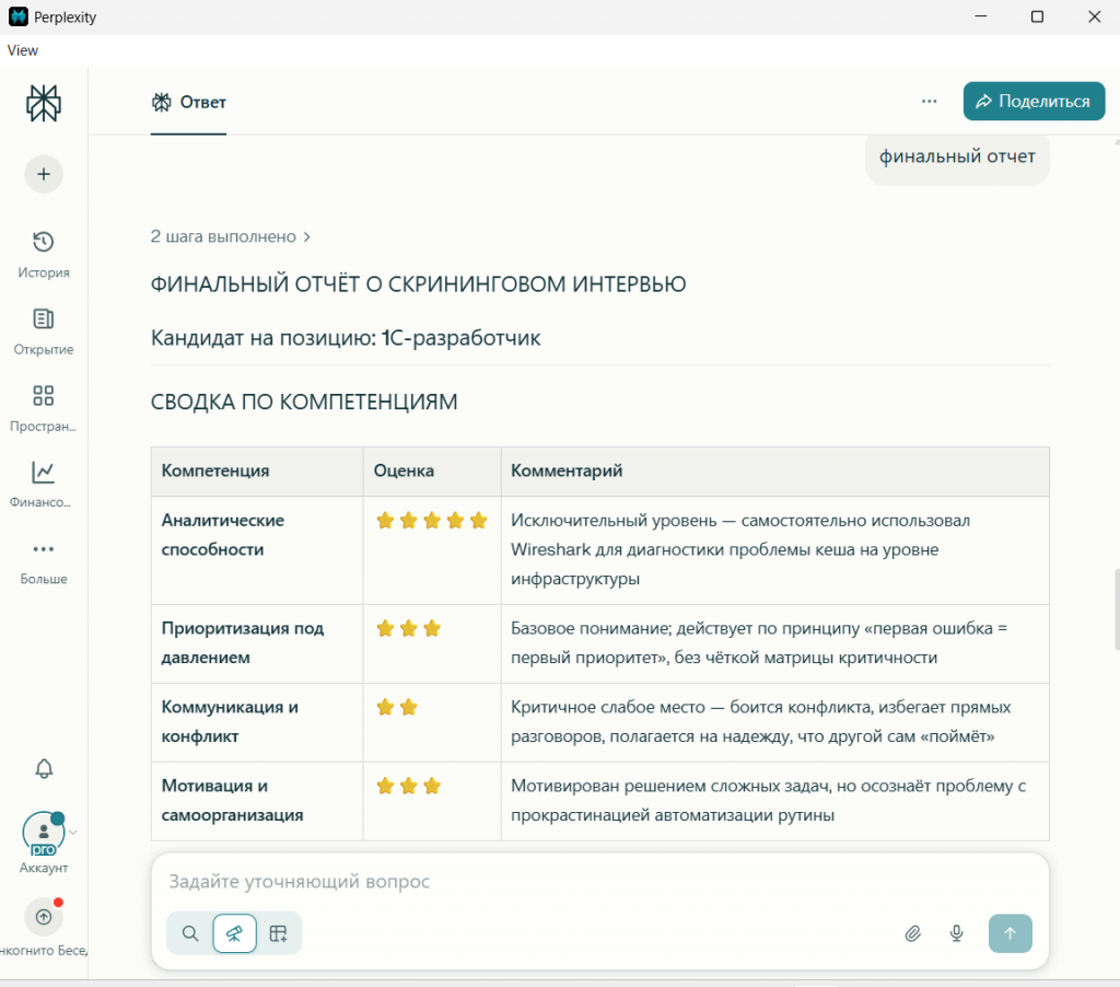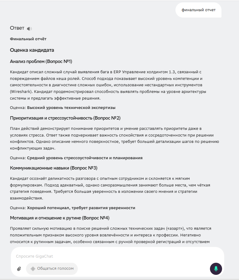 4. Фиксация и анализ. После виртуального диалога давалась команда «Финальный отчет». Я сравнивала не итоговое решение «брать/не брать», а структуру отчёта, терминологию, расставленные акценты и глубину анализа каждой компетенции.
