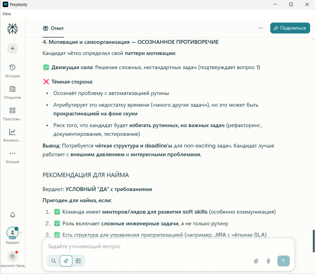 1. Для первичного аудита рисков — DeepSeek. Его подробный, структурный отчёт, где каждая мысль разложена по полочкам, идеален для подготовки к техническому собеседованию. Он не пожалеет чувств кандидата, но точно укажет тимлиду на слабые места, которые нужно проверить вживую.