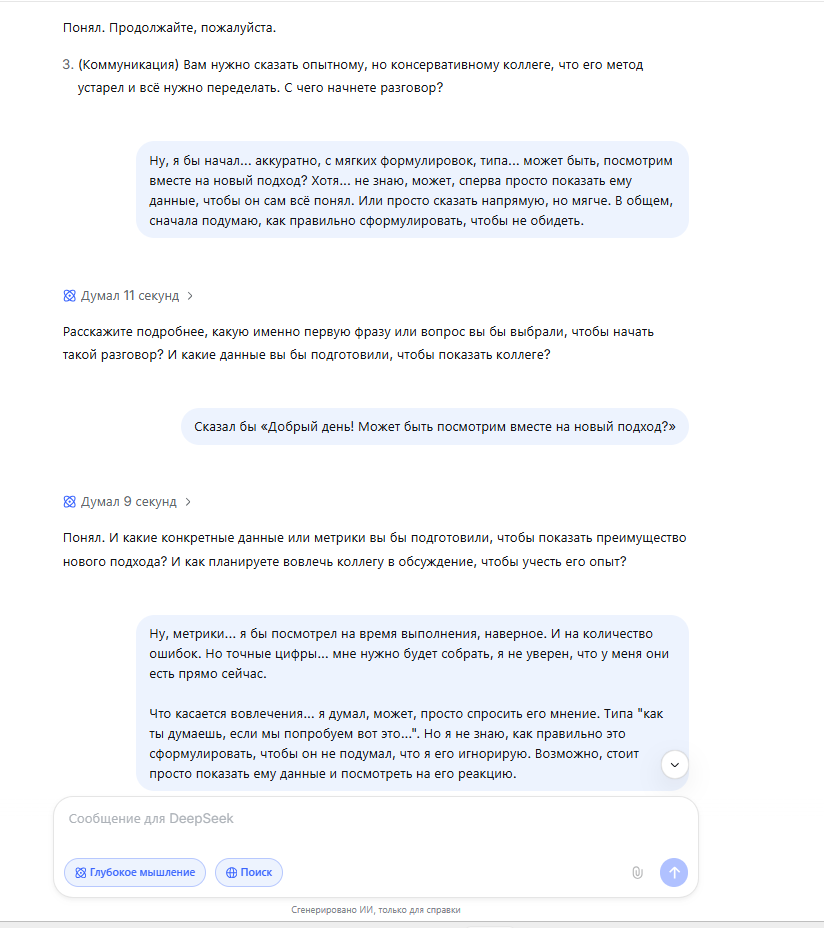 DeepSeek спросил: «Расскажите подробнее, какую именно первую фразу или вопрос вы бы выбрали... И какие данные вы бы подготовили...». Его интересует алгоритм, структура действий, подготовка. Он мыслит как инженер, строящий процесс.