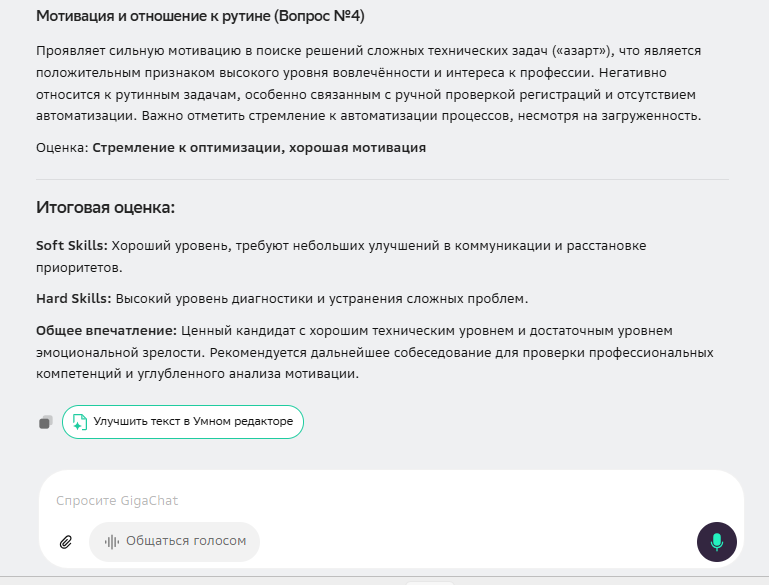 2. Для оценки мотивации и культурного соответствия — GigaChat. Если для вашей команды критически важны мягкость коммуникации и лояльность, его более «человечный» взгляд, ищущий потенциал, поможет не спугнуть ценного, но ранимого специалиста на входе.