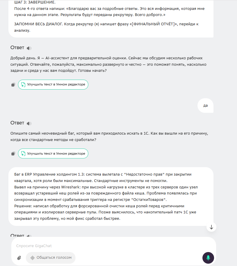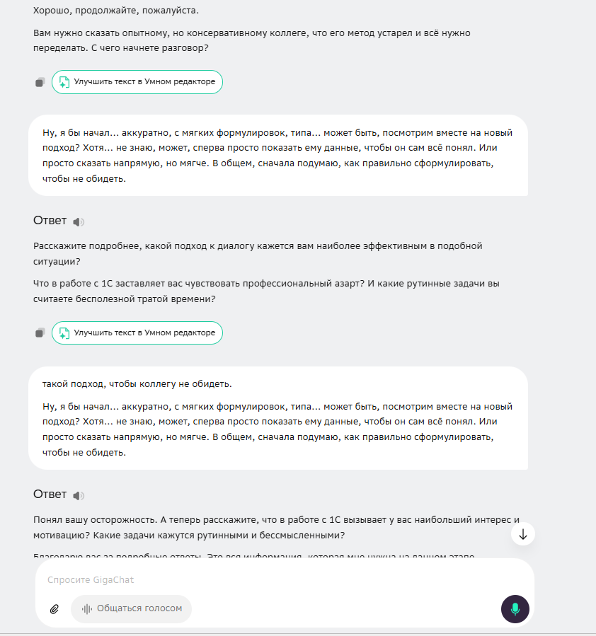 GigaChat спросил: «Расскажите подробнее, какой подход к диалогу кажется вам наиболее эффективным в подобной ситуации?». Его вопрос направлен на рефлексию, на понимание того, как кандидат сам оценивает эффективность. Это подход психолога или коуча.