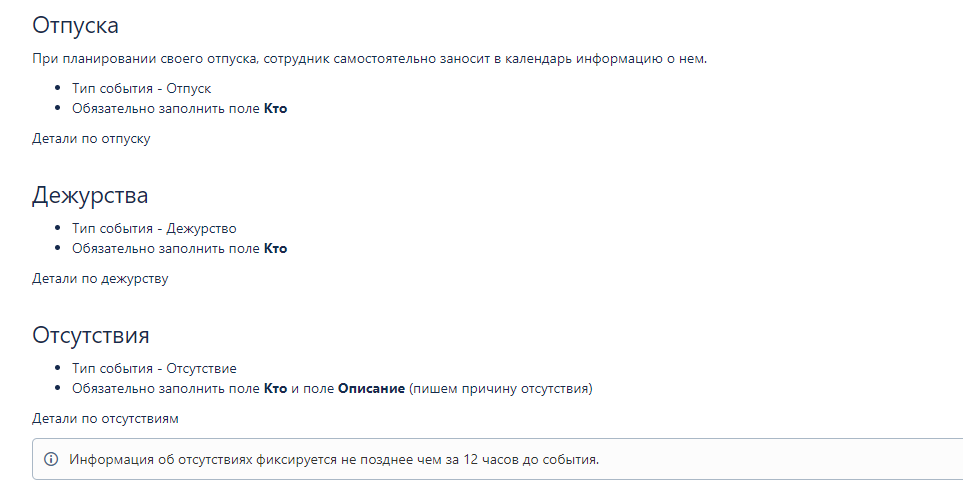 Первый пример – про отпуска, дежурства и отсутствие сотрудников. Это различные day off, выходные, болезни и другие случаи отсутствия.