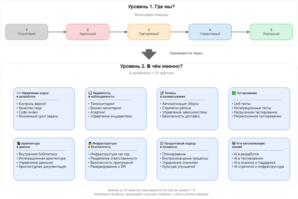 Это натолкнуло меня на мысль: сообществу 1С нужен собственный инструмент — не замена корпоративным стандартам, а дополнение, которое говорит на языке платформы. Так появилась двухуровневая модель оценки для команд 1С, в которой важен не факт наличия процессов, а то, как именно они устроены и насколько осмысленно применяются. Она позволяет оценивать не только соответствие чек-листу, но и глубину инженерной культуры.