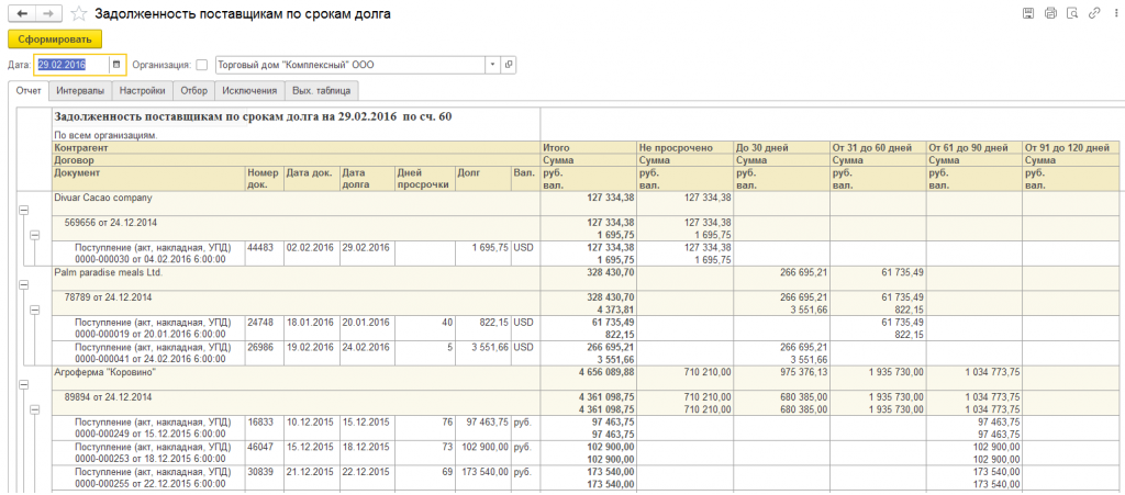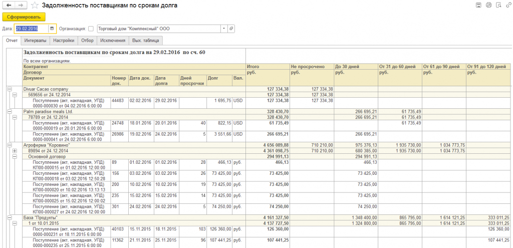 Отчет "Задолженность поставщикам по срокам долга" предназначен как для бухгалтера, так и для пользователя, не владеющего бухгалтерской терминологией (руководителя, менеджера).