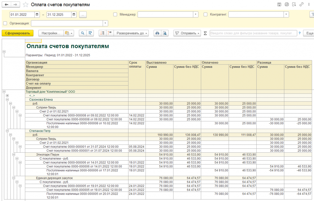 Оплата счетов покупателям по менеджерам /контрагентам / договорам