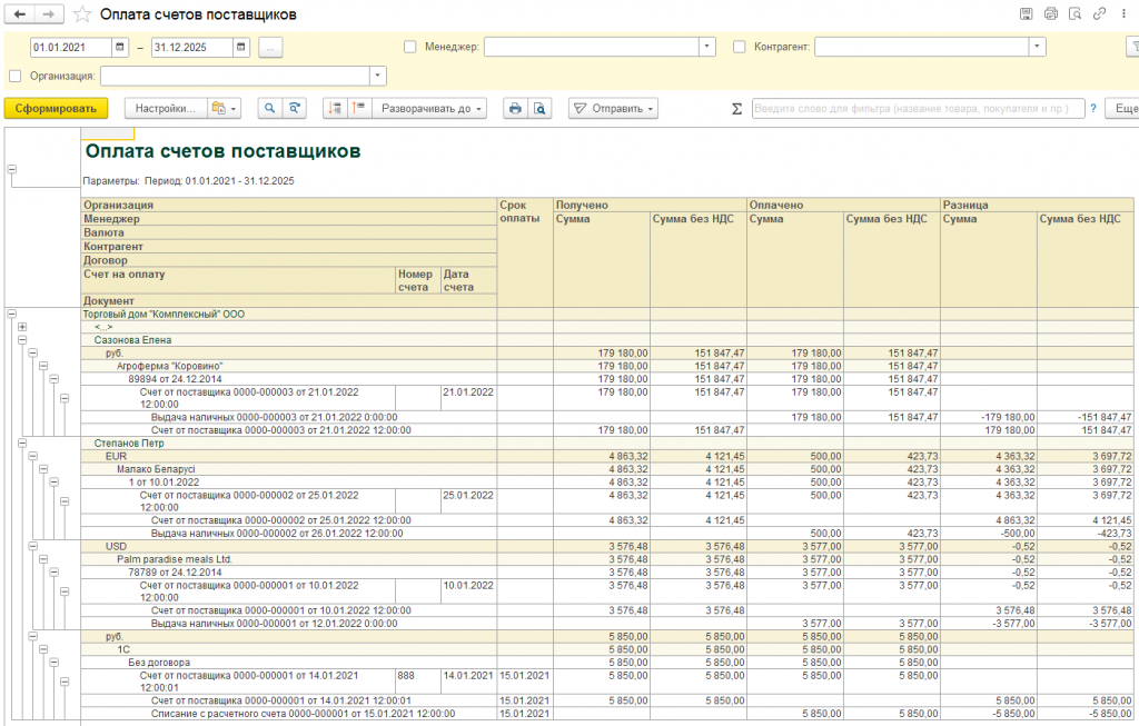 - Оплата счетов от поставщиков в разрезе менеджеров