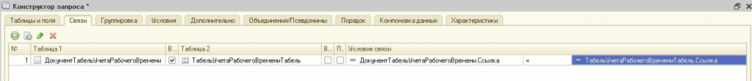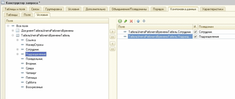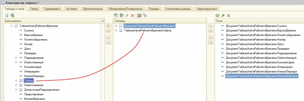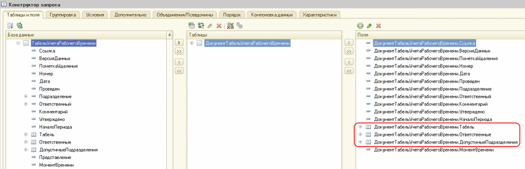 Перейдем в конструктор запроса и увидим, что по умолчанию в поля добавились табличные части документа. Они там не нужны и нам их нужно оттуда убрать: