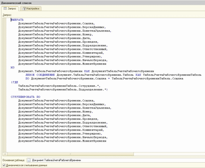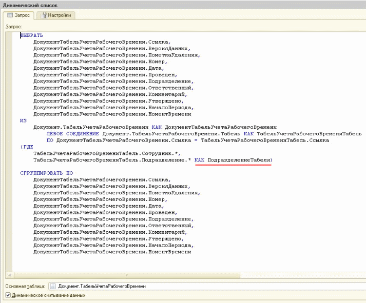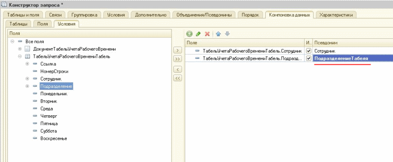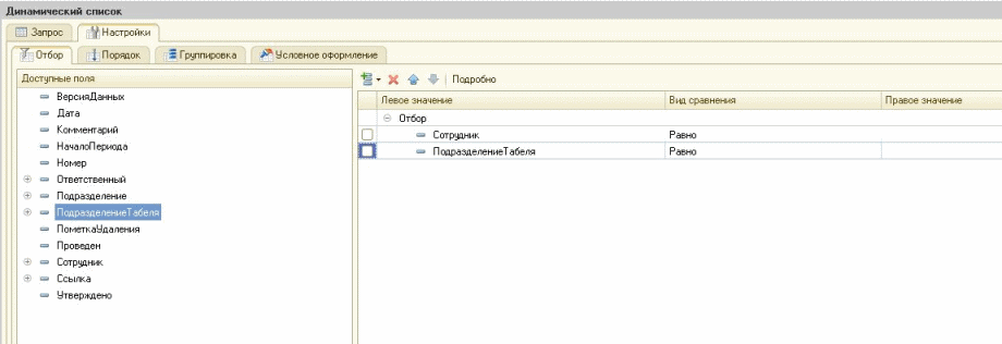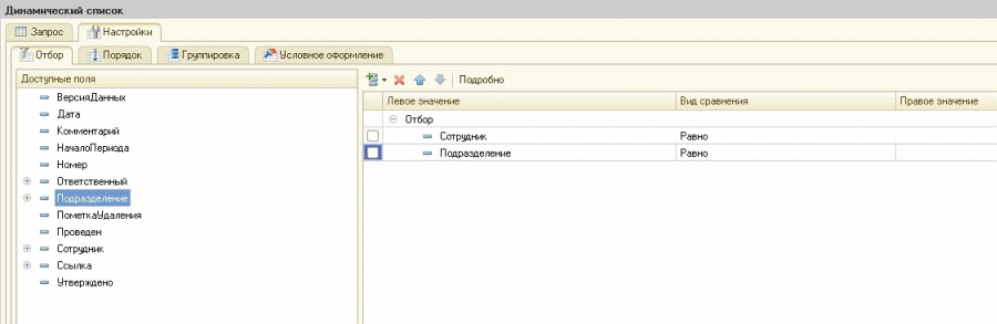 Обратите внимание на то, что реквизит "Подразделение" присутствует как в шапке, так и в табличной части, а в доступных полях отбора всего одно поле, и в такой реализации будет установлен отбор по реквизиту табличной части. Если же нам нужен отбор и по подразделению из шапки, то нужно просто задать другое имя отбора для табличной части: