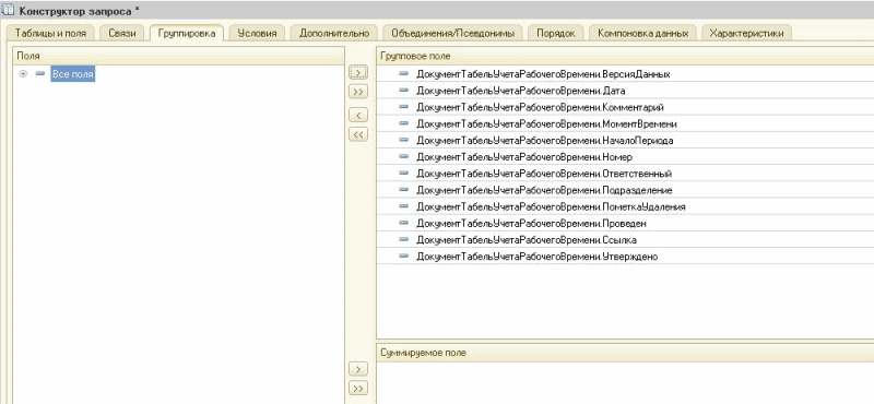 Теперь группируем все поля, здесь полей табличной части быть не должно: